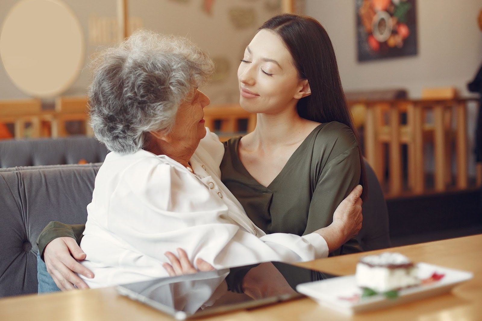 Adult daughter comforting her elderly mother during an emotional conversation at a café.